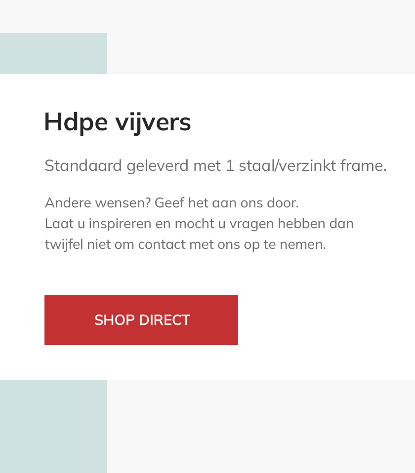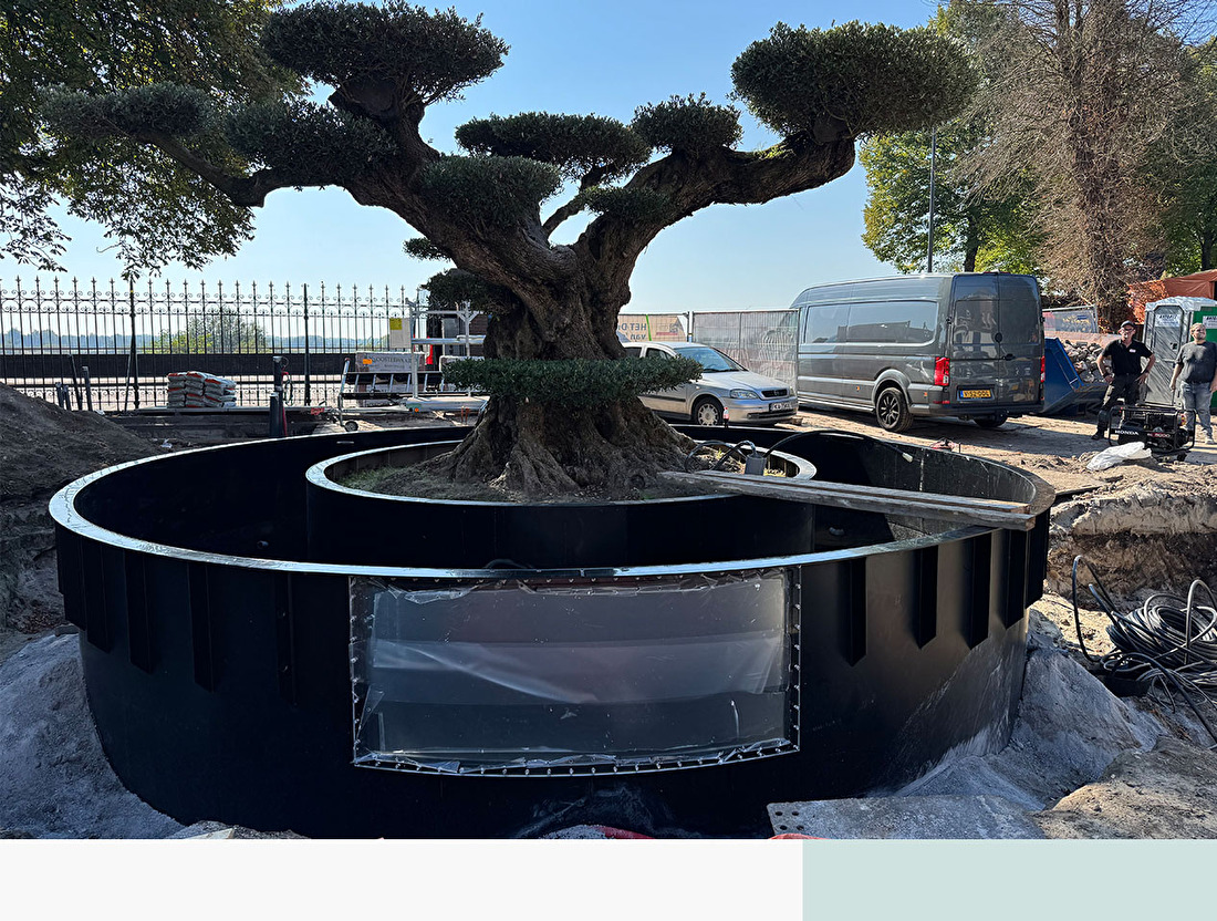 Op zoek naar een vijver of ontwerp? Wij maken een vijver graag voor u op maat. Let wel het is noodzakelijk dat u de bak vult tot aan maaiveld en dan het bovende grond uitstekende gedeelte stevig afwerkt dit ivm de waterdruk want niet alles is op te vangen met steigerbuis